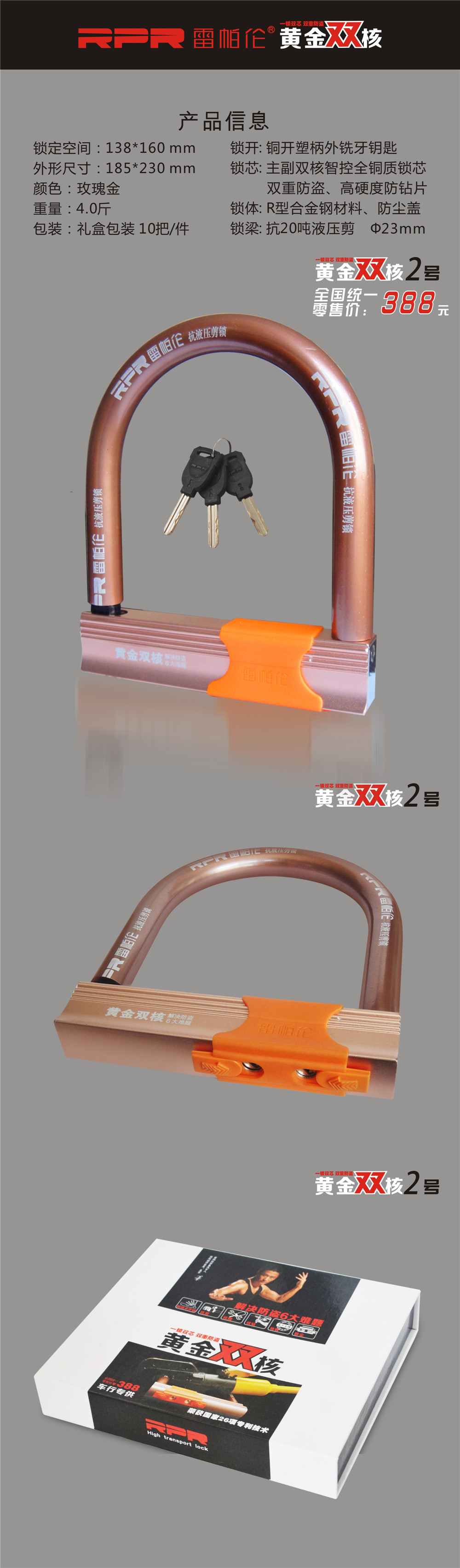 雷帕倫黃金雙核系列鎖具,是您電動車、摩托車、助力車防盜必備佳品,為您的愛車上一道安全保障,使您的愛車出行更安全,防止被盜。