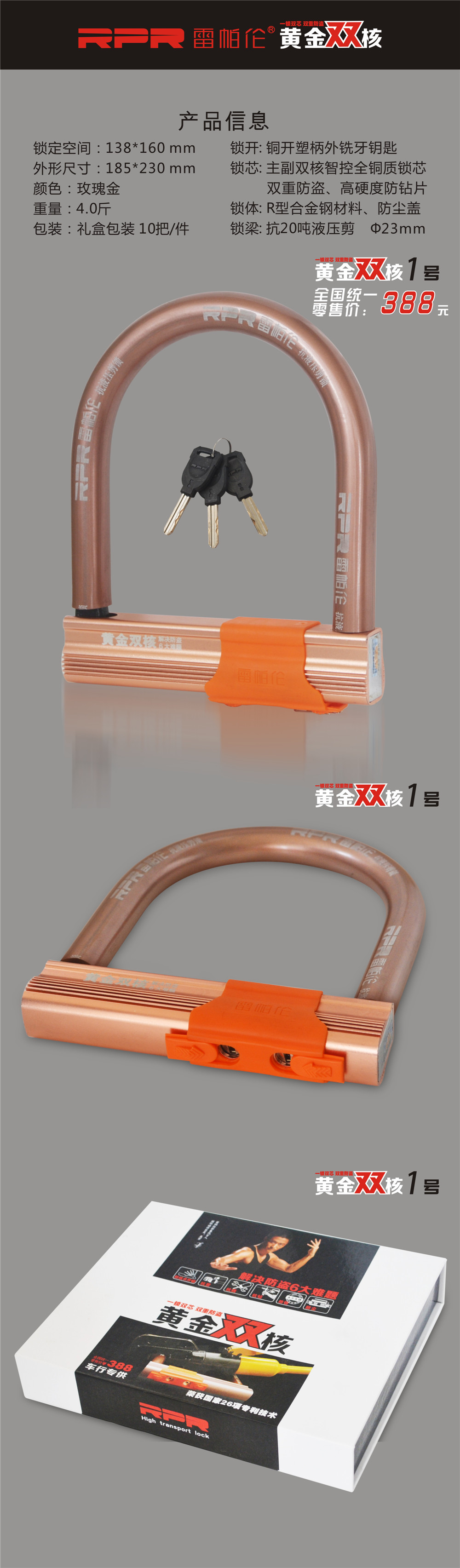 雷帕倫黃金雙核系列鎖具,是您電動(dòng)車、摩托車、助力車防盜必備佳品,為您的愛車上一道安全保障,使您的愛車出行更安全,防止被盜。